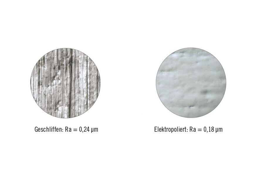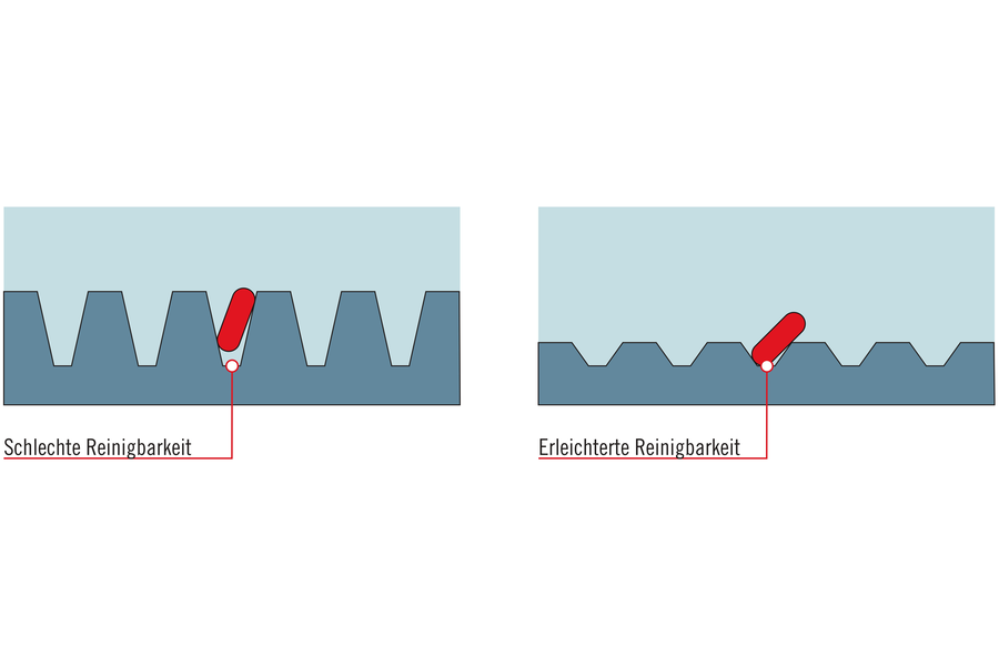 Die Struktur und Rauheit einer Oberfläche ist ein entscheidender Faktor für die Reinigung von Schmutz und Mikroorganismen. Nur eine fehlerfreie Oberfläche ohne Kratzer, Poren, Spalten und Risse lässt sich mit automatisierten Verfahren reinigen und sterilisieren.