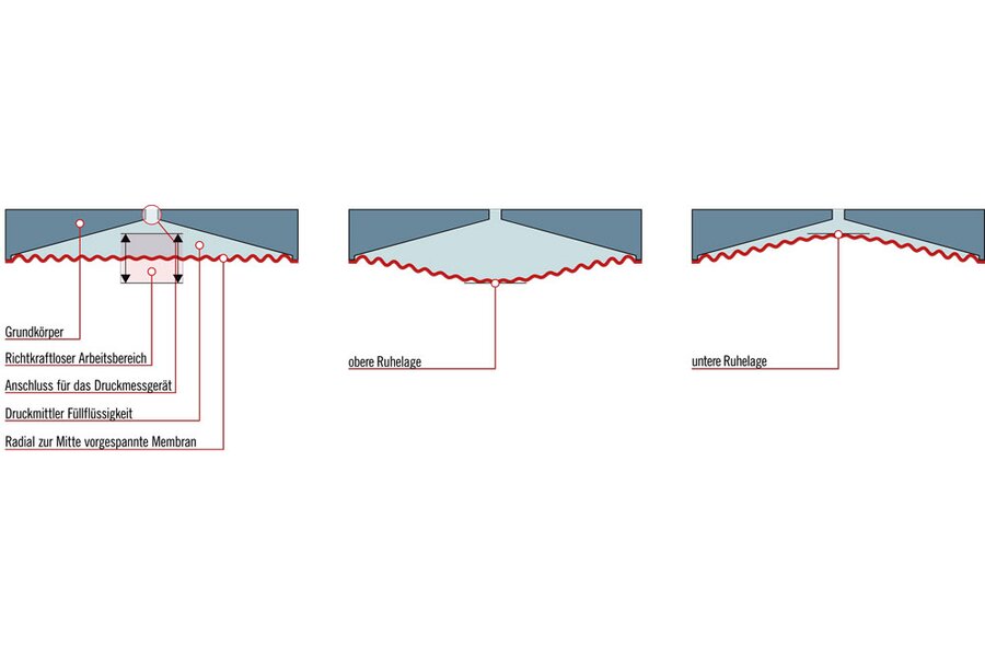 Die von Labom selbst entwickelte LTC-Membran (LTC = Low Temperature Coefficient) kompensiert die temperaturbedingte Volumenaus dehnung der Druckübertragungsflüssigkeit mit einer Edelstahlmembran. Die mechanisch robuste Edelstahlmembran mit einer Stärke von mindestens 0,1 mm wird durch ein spezielles Herstellungsverfahren so in eine Position zwischen zwei Nulllagen gebracht, dass sie nahezu richtkraftlos arbeitet. Dadurch nimmt die Membran Volumenänderungen der Flüssigkeit durch Temperatureinfluss nahezu rückwirkungsfrei auf. Gegenüber herkömmlichen Sinusmembranen kann eine LTC-Membran eine um bis zu 70 Prozent höhere Messpräzision liefern.
