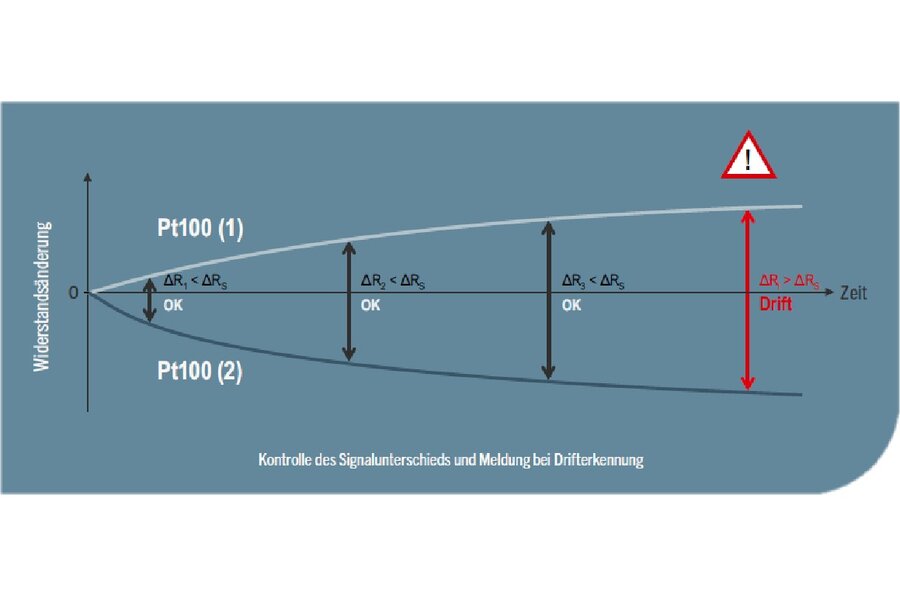 Eine Lösung bietet hier der Temperaturmessumformer GV4 MiniTherm, optional ausgestattet mit dem Funktionspaket Selbstüberwachung. Die Temperaturmessung erfolgt über zwei Pt100, deren Besonderheit darin besteht, dass aufgrund ihres physikalischen Aufbaus ein entgegengesetztes Driftverhalten sichergestellt ist. Mit jedem Messwert erfolgt eine kontinuierliche Kontrolle des Signalunterschieds (ΔR), so dass das Überschreiten eines Schwellenwertes (ΔRS) direkt festgestellt werden kann und die Driftwarnung ausgelöst wird.