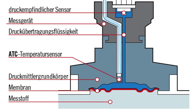 Mittels Druckmittlersystemen lässt sich für fast jede Druckmessaufgabe eine Lösung finden. Nachteilig dabei ist, dass ein Messfehler durch den Einfluss der Prozesstemperatur auftreten kann. Durch die Prozesswärme dehnt sich die Druckübertragungsflüssigkeit und lenkt die Trennmembran aus. Abhängig von deren Steifigkeit erzeugt diese eine Rückstellkraft, die als Fehler in die Druckmessung eingeht.