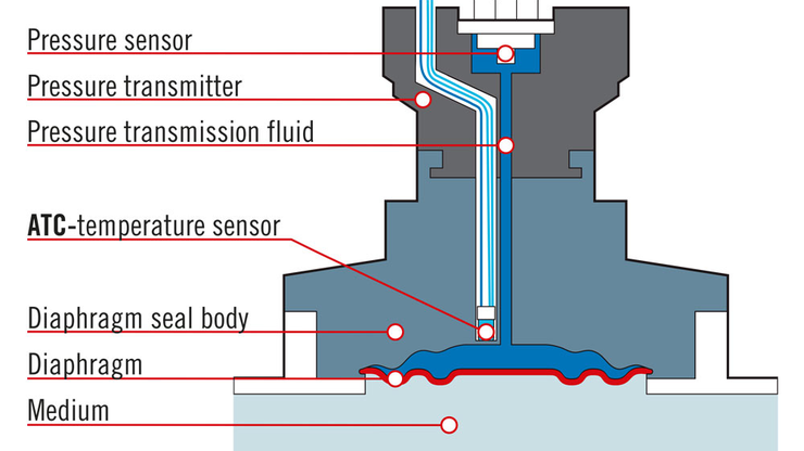 Diaphragm seals are frequently used in the process industry for pressure measurements to protect the measuring device against aggressive media or to create a gap-free process connection. A drawback is that the diaphragm seal is not completely non-reactive. The pressure transmission fluid expands as a result of the process heat and deflects the separating diaphragm. This generates a restoring force depending on the rigidity of the above mentioned diaphragm, which is received as an error in the pressure measurement.