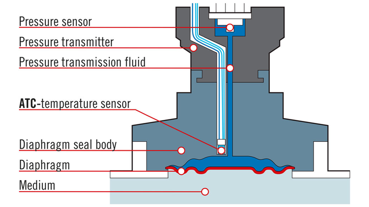 To remedy this, Labom has developed and implemented a further compensation process to create a solution for this problem. The temperature of the pressure transmission fluid is recorded with an additional temperature sensor (ATC technology (ATC = Active Temperature Compensation)). This sensor is positioned as close as possible to the separating diaphragm. The sensor thus records the temperature of the liquid behind this diaphragm with good accuracy.